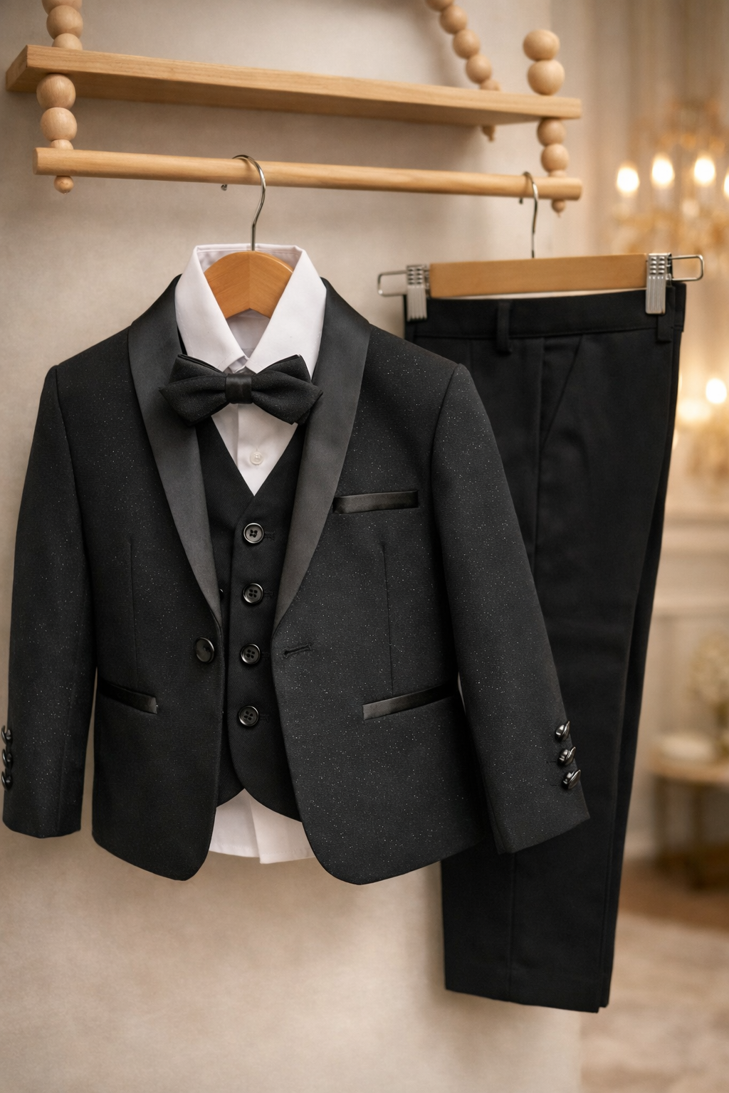 Il tessuto leggermente brillante e i dettagli curati rendono questo completo ideale per le occasioni più importanti, facendo sentire ogni bambino un vero piccolo gentiluomo