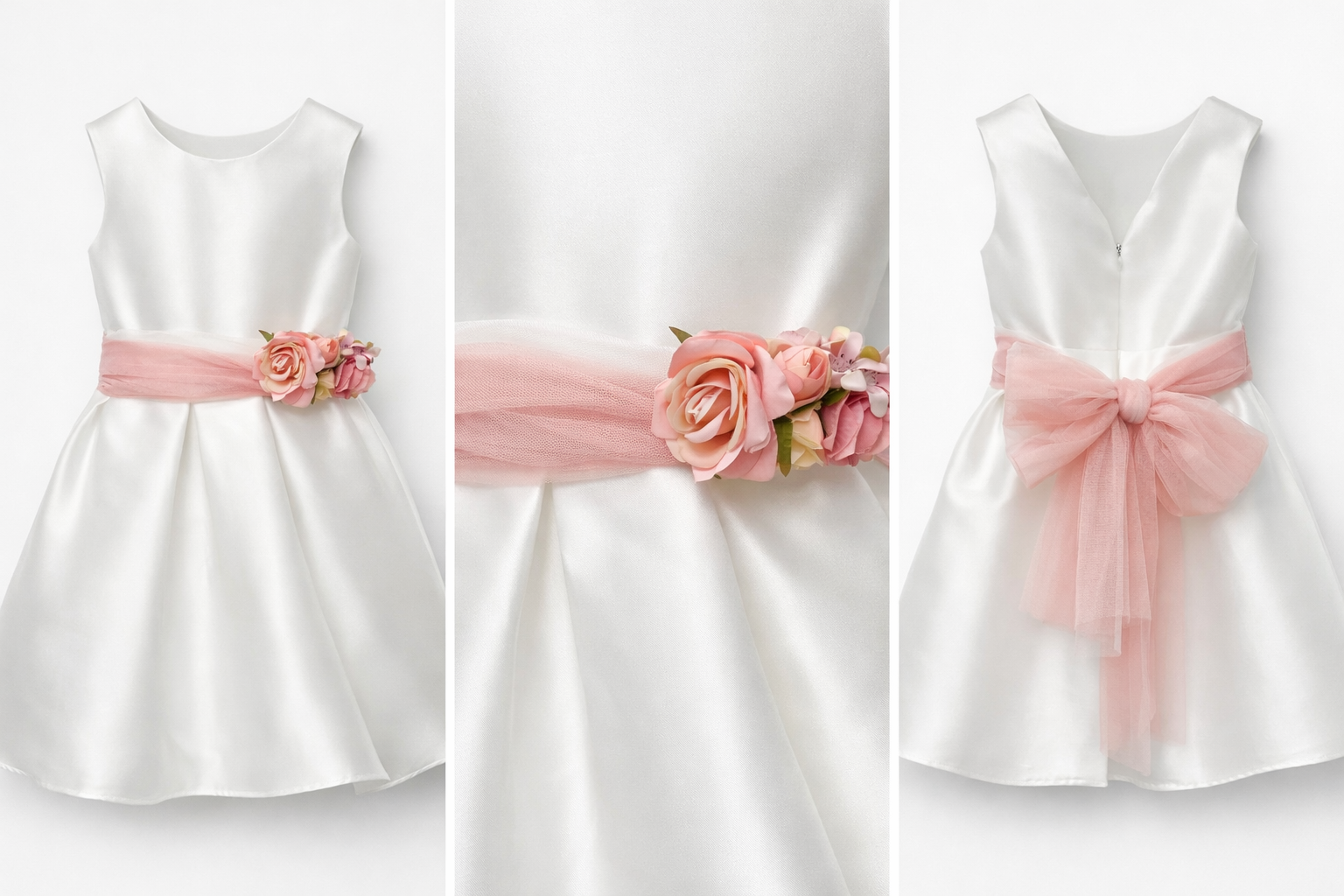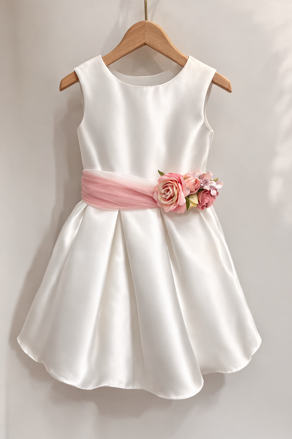 Elegante abito da cerimonia per bambina realizzato in raso lucido color avorio, perfetto per occasioni speciali come battesimi, comunioni, matrimoni e feste